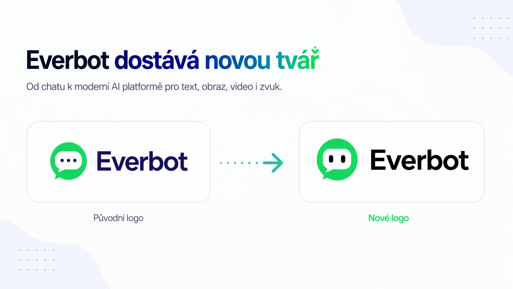 Tři tečky symbolizovaly chat – dialog, komunikaci. Ale Everbot už dávno není jen chat. Je to kompletní AI platforma, která vidí, tvoří a rozumí – text, obraz, video i zvuk. Nové oči symbolizují vnímavost, aktivní přístup a inteligenci, která nejen odpovídá, ale také vidí svět kolem sebe. A to je teprve začátek, v tomto roce připravujeme také agenty, kteří za vás budou konat.