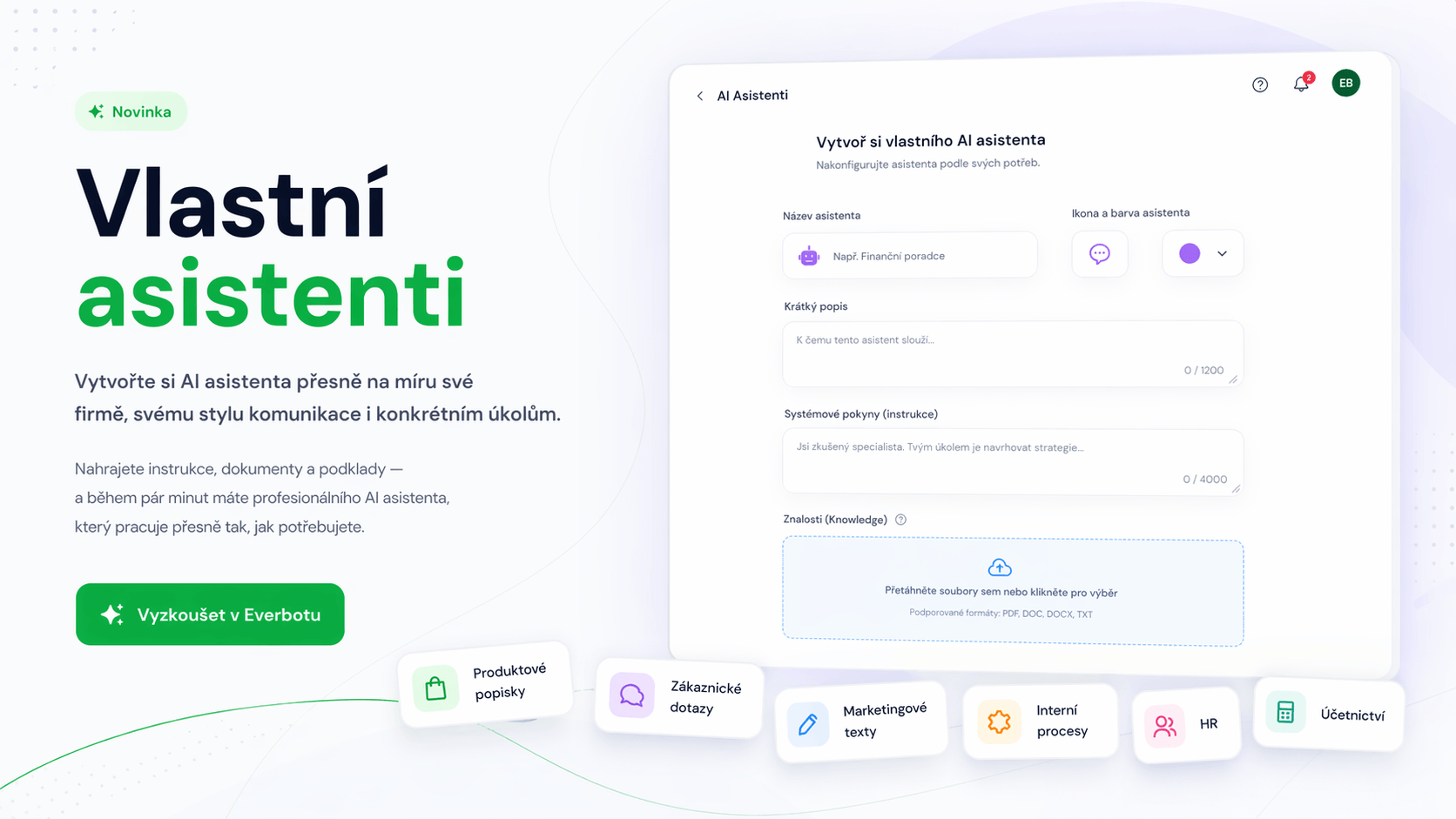 Každý zákazník Everbotu si nyní může vytvořit svého vlastního AI asistenta – přesně na míru své firmě, svému stylu komunikace a konkrétním úkolům, které řeší.