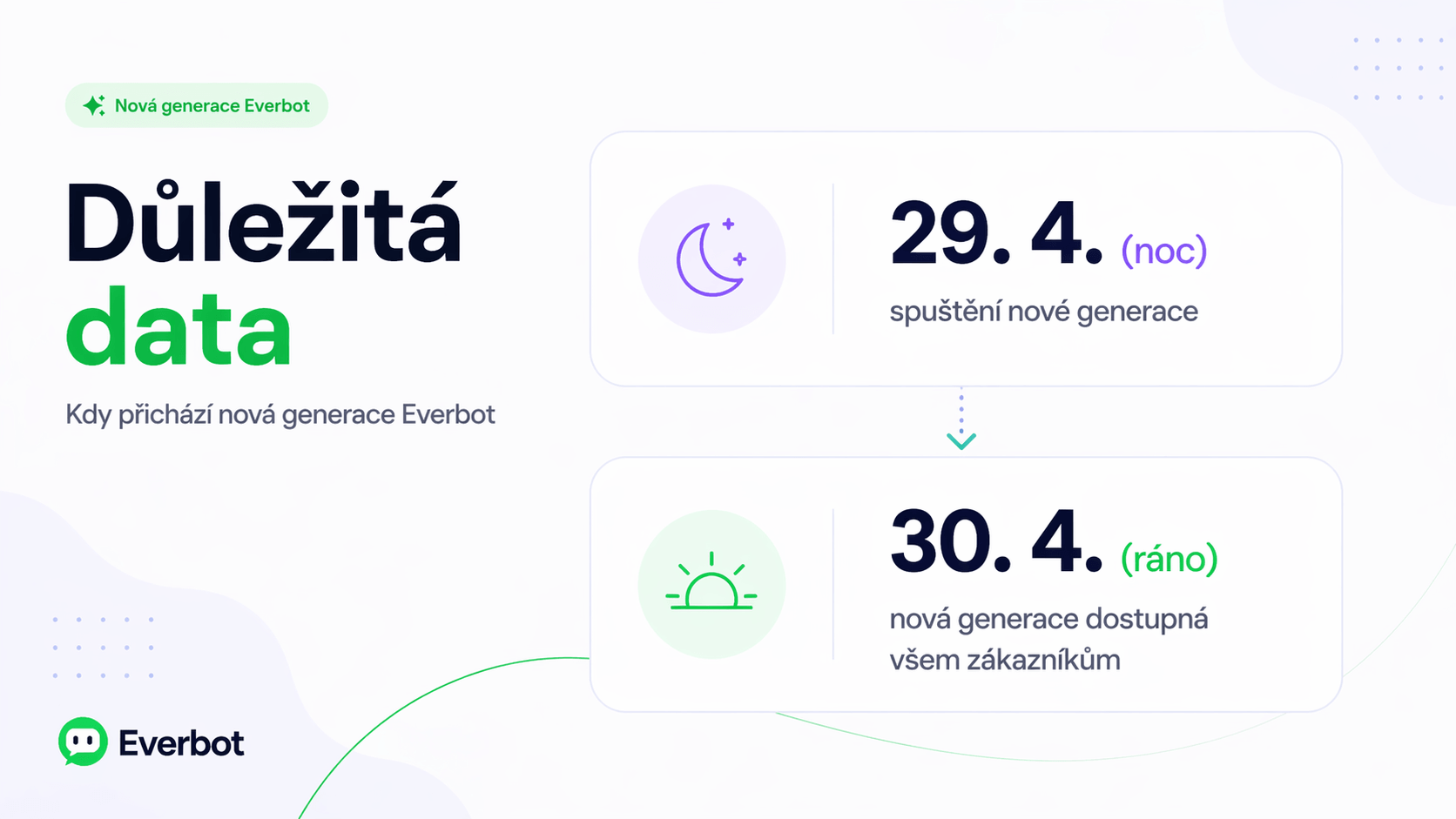 Novou aplikaci spouštíme v noci ze středy 29. 4. na čtvrtek 30. 4. 2026. Ráno 30. dubna se po přihlášení automaticky ocitnete v nové generaci Everbot.